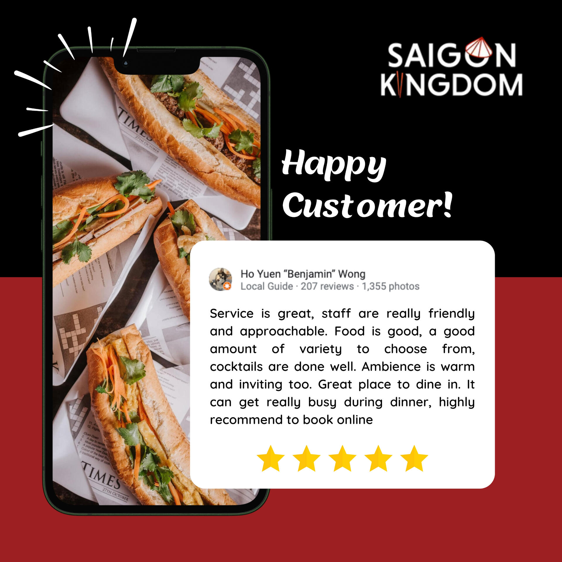 We would greatly appreciate your feedback on your dining experience at Saigon Kingdom Steamer Wharf today.Please rate it on a scale of 1 to 5, with 5 representing the highest level of satisfaction.